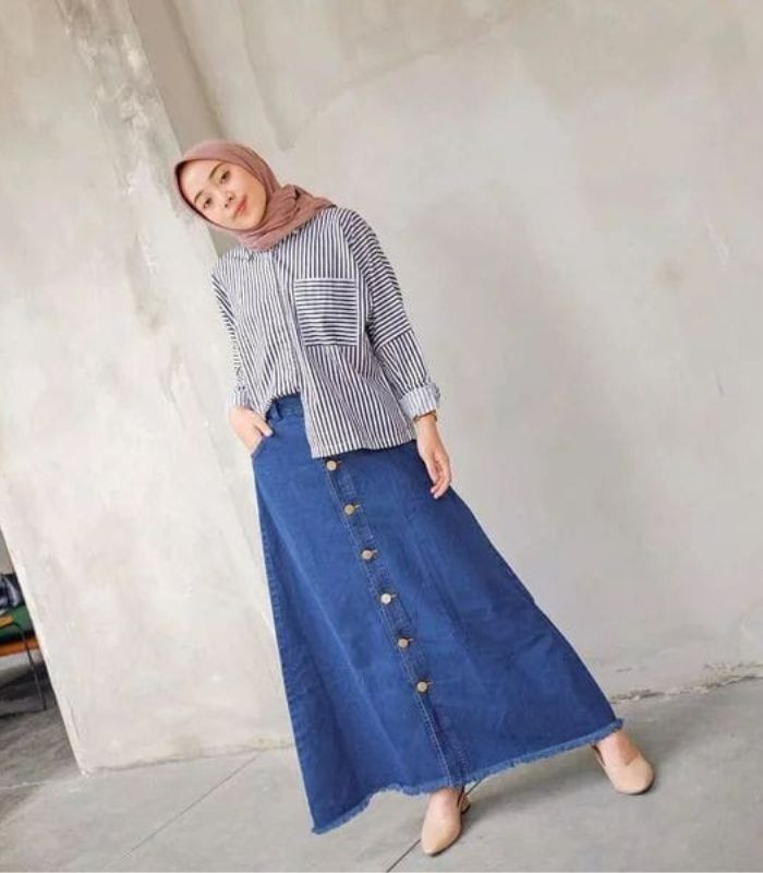 4. Penampilan satu ini cukup simpel. Padukan saja striped shirt dengan button maxi skirt jeans dan hijab segi empat berwarna choco. Bikin penampilanmu jadi lebih chic!