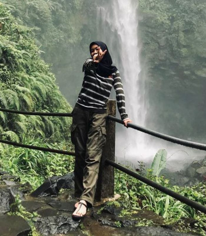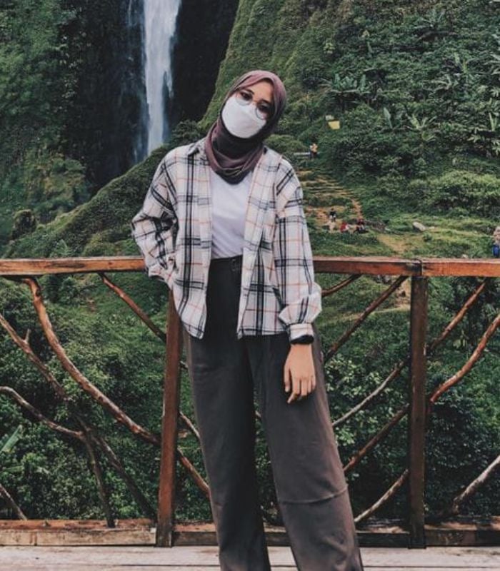 3. Penampilan satu ini cukup simpel dan mudah untuk ditiru. Kombinasikan striped long sleeve t-shirt dan hijab segi empat berwarna hitam senada dipadukan dengan cargo pants berwarna army, tampil siap di segala cuaca.