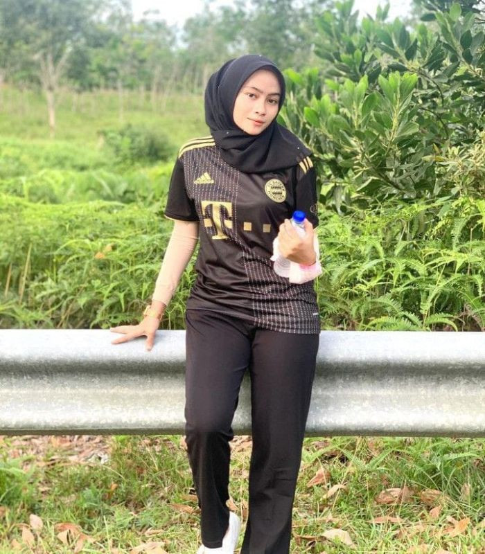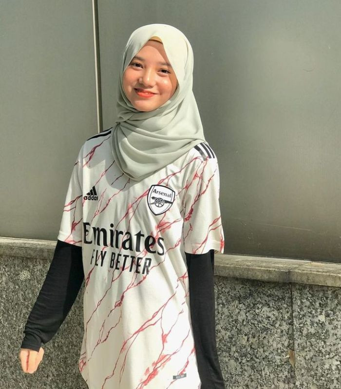 9. Padukan black long sleeve t-shirt dibalut dengan one set navy jersey t-shirt dan dilengkapi dengan long pants dan hijab instant berwarna senada. Siap tampil eye-catchy dukung tim andalanmu.