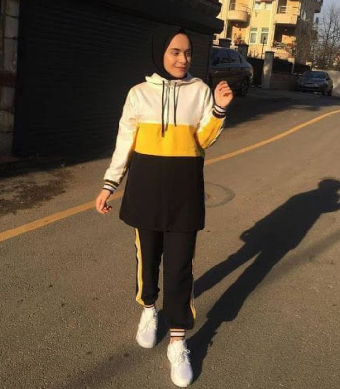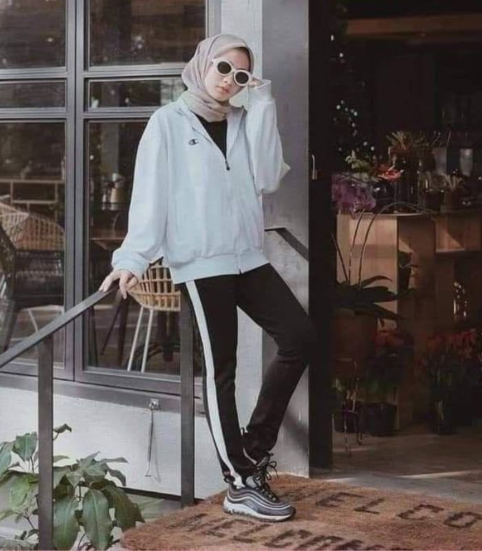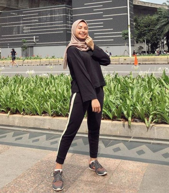 6. Kenakan one set terdiri dari hoodie seperti ini yang dipadukan dengan jogger pants berwarna senada dan hijab pashmina berwarna hitam. Jadi bikin penampilanmu makin stylish yang eye-catchy.