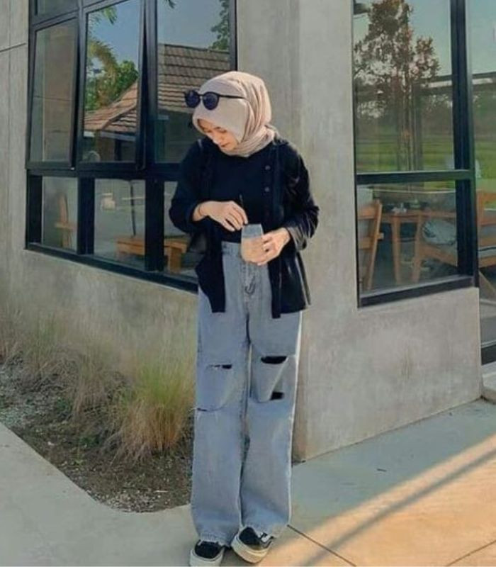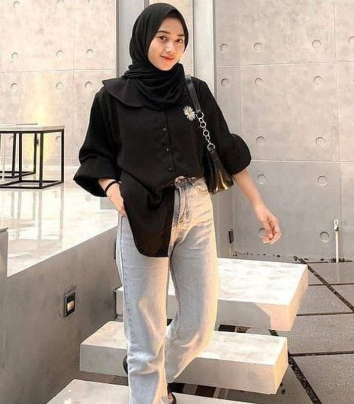 3. Kenakan kemeja dengan aksen collar dan hijab pashmina berwarna hitam senada dipadukan dengan highwaist loose wide leg jeans. Lengkapi gayamu dengan shoulder bag dan slip-on sandals. Jadi tampil lebih kece yang anggun.