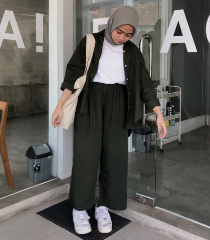4. Gunakan white t-shirt dibalut dengan black shirt dipadukan dengan celana kulot deep army dan hijab segi empat. Lengkapi outfit dengan tote bag dan sneakers, bikin gayamu tampil casual look.