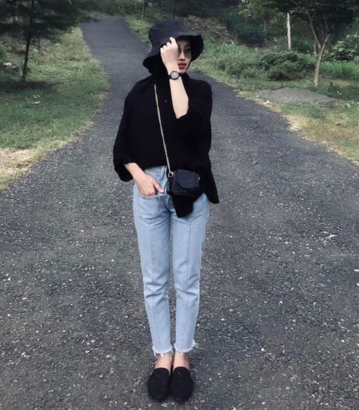 5. Simpel saja kombinasikan black oversized shirt dipadukan dengan celana boyfriend jeans. Buat penampilanmu jadi lebih stand out dengan menggunakan bucket hat, sling bag, dan flat shoes.