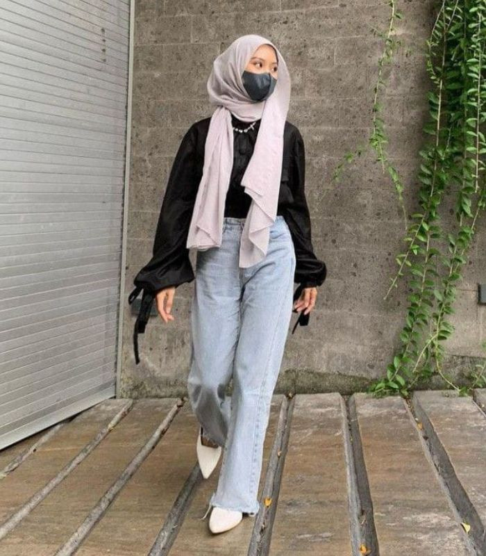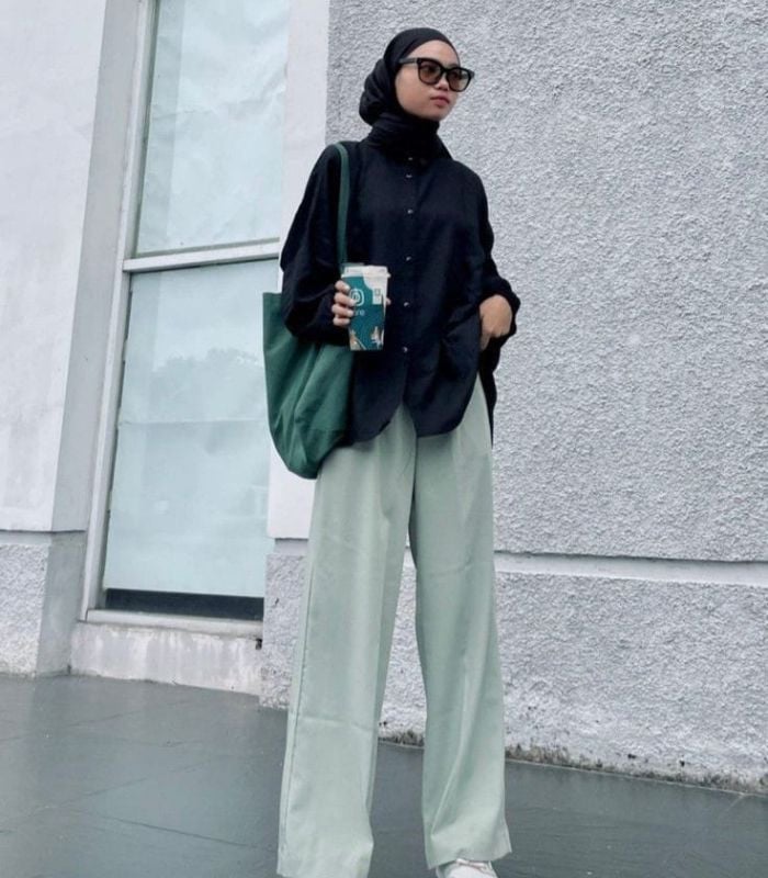 7. Kenakan oversized shirt dan hijab pashmina berwarna hitam senada dikombinasikan dengan highwaist loose wide leg pants berwarna hijau telur asin. Berikan statement pada gaya hijabmu dengan sunglasses dan tote bag.