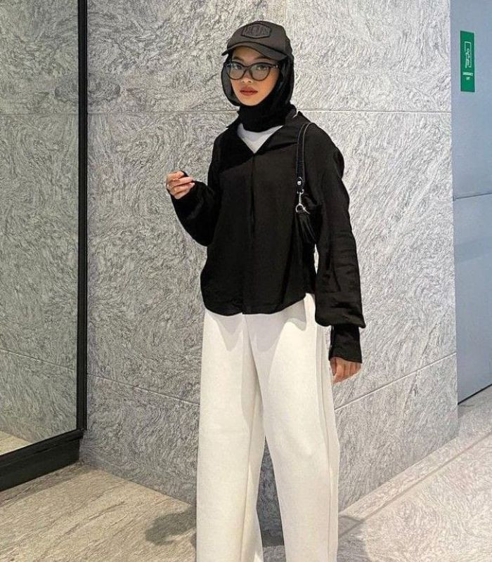 9. Terakhir, cocok buat Anda si pecinta monokrom style. Padukan saja white t-shirt sebagai dalaman-nya dibalut dengan kemeja dan hijab segi empat berwarna hitam senada serta highwaist loose wide leg pants berwarna putih. Tampil lebih gaya dengan menggunakan kacamata, shoulder bag dan topi.
