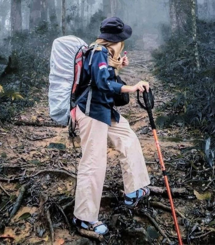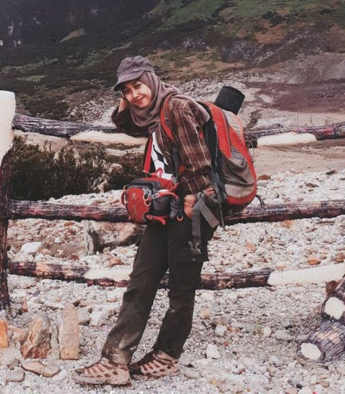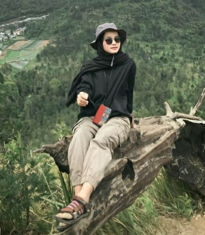 4. Mix and match kemeja PDL dengan celana kulot berwarna ivory yang dipadukan dengan hijab segi empat berwarna soft yellow, tak ketinggalan dengan bucket hat dan sandal gunung. Tampil simpel yang memberikan kesan rapi.