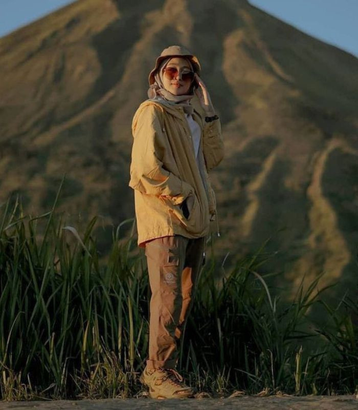 3. Gunakan white t-shirt dibalut oversized jacket berwarna soft yellow dipadukan dengan hijab segi empat berwarna beige dan cargo pants berwarna soft choco, lengkapi dengan bucket hat, sunglasses, dan sepatu gunung. Bikin tampilanmu jadi lebih boyfie yang kekinian.