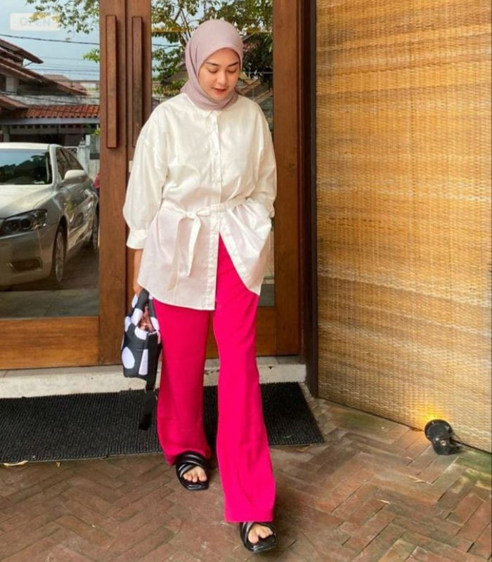 2. Kombinasikan oversized shirt dengan aksen tali dipinggang dan highwaist loose pants berwarna fuschia dipadukan hijab segi empat berwarna cruele pink, sempurnakan outfit-mu dengan hand bag dan slip on-sandals. Tampil kekinian yang memberikan kesan feminin look.