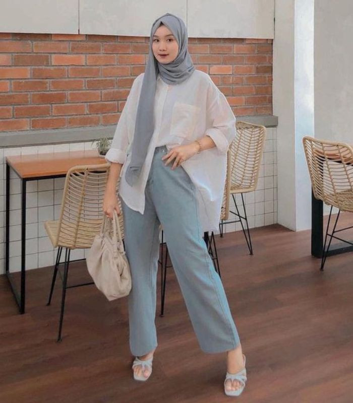 4. Cukup simpel, gunakan saja white oversized shirt dipadukan dengan hijab pashmina dan highwaist loose pants bernuansa biru yang senada, lengkapi outfit dengan hand bag dan slip-on sandals.