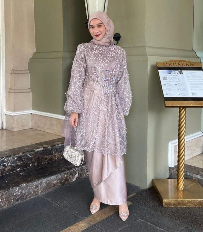 10. Gaya satu ini memberikan kesan yang anggun nan eye-catchy. Padukan long sleeve inner dibalut dengan blouse kebaya model brukat modern dan hijab segi empat serta rok lilit polos satin dengan warna soft purple yang senada. Lengkapi outfit dengan hand bag dan flat shoes andalanmu.