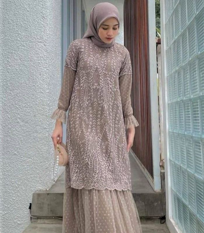 11. Terakhir, simpel saja gunakan long dress dengan model brukat seperti satu ini padukan dengan hijab segi empat berwarna choco yang senada. Jadi bikin tampil modis yang anggun.