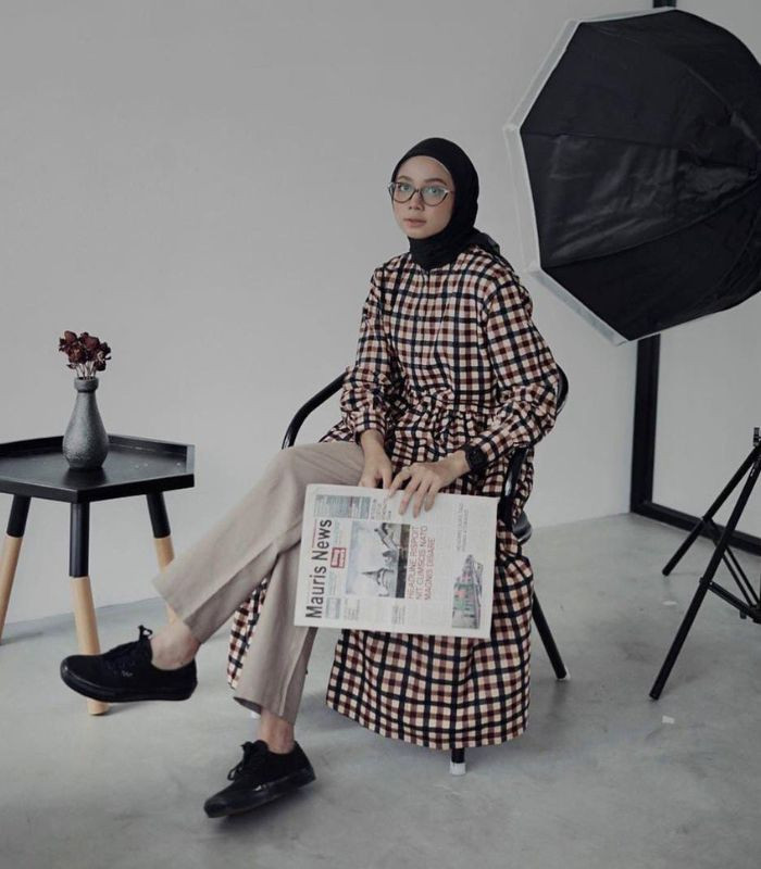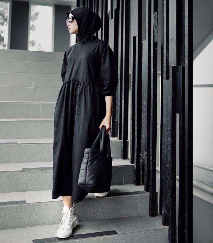 8. Style satu ini bertemakan dark academia dengan vibe preppy bernuansa warna gelap. Gunakan long dress vintage dan hijab segi empat berwarna hitam yang senada, lengkapi outfitmu dengan sunglasses, hand bag, serta sneakers. Bikin penampilanmu stylish namun tetap elegan.