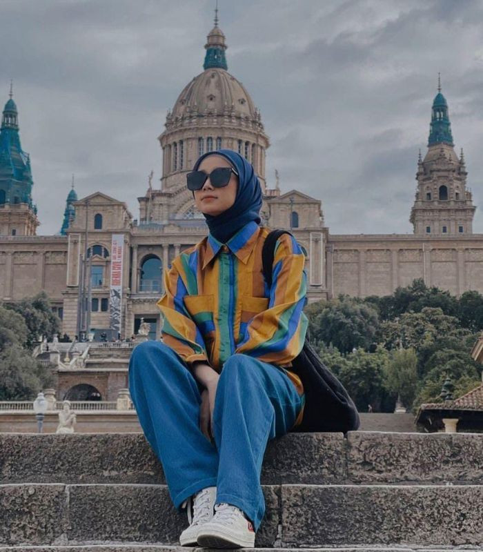 6. Cocok buat Anda yang ingin tampil dengan style artsy. Gaya satu ini berani dengan memadukan oversized shirt bercorak dan highwaist loose wide leg jeans serta hijab segi empat berwarna navy. Bikin penampilanmu cerah dan berseni.