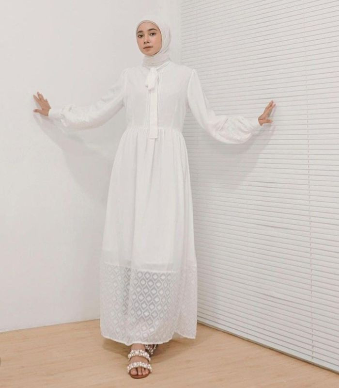7. Menggambarkan style cottagecore dengan gaya feminin look, gunakan white long dress dan hijab segi empat berwarna senada. Jadi bikin tampilanmu bak style ala gadis pedesaan.