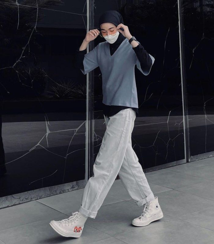 9. Kombinasikan long sleeve t-shirt inner dibalut dengan grey t-shirt model v-neck dan celana boyfriend jeans berwarna putih serta hijab segi empat berwarna hitam. Memberikan kesan vibe preppy dengan nuansa gelap namun tetap modis!