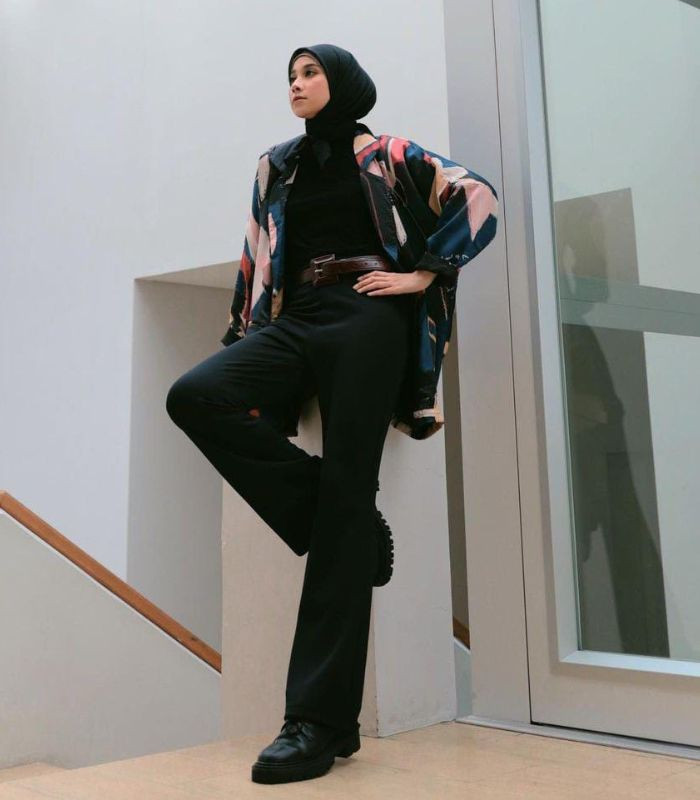 10. Padukan black t-shirt dibalut dengan kemeja bermotif abstrak dengan hijab segi empat serta highwaist loose wide leg pants berwarna hitam senada. Berikan statement pada gaya outfitmu dengan sepatu boots bernuansa vintage.