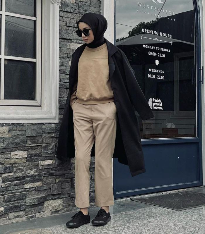 11. Penampilan ini menunjukkan style formal nan rapi dengan warna cerah. Gunakan sweatshirt dan ankle pants berwarna khaki yang senada dipadukan dengan hijab segi empat dan semi long outer berwarna hitam. Jadi bikin gayamu tampil lebih stylish.