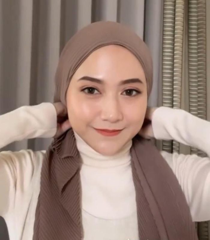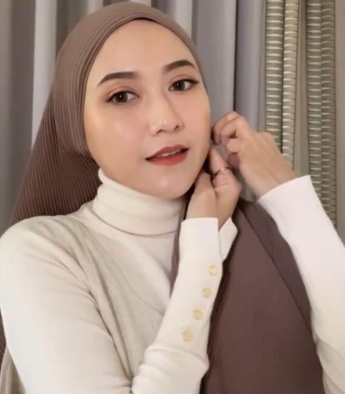 Pada tahap berikutnya, Khaerunnisa memberikan tutorial cara pemakaian hijab pashmina dengan sangat mudah. Untuk langkah kedua ini, pastikan kedua sisi hijab pashmina di bawa ke belakang leher dan ditautkan dengan membentuk kedua sisi bagian wajah simetri dan rapi. Setelah itu sematkan dengan jarum pentul atau peniti disesuaikan saja.