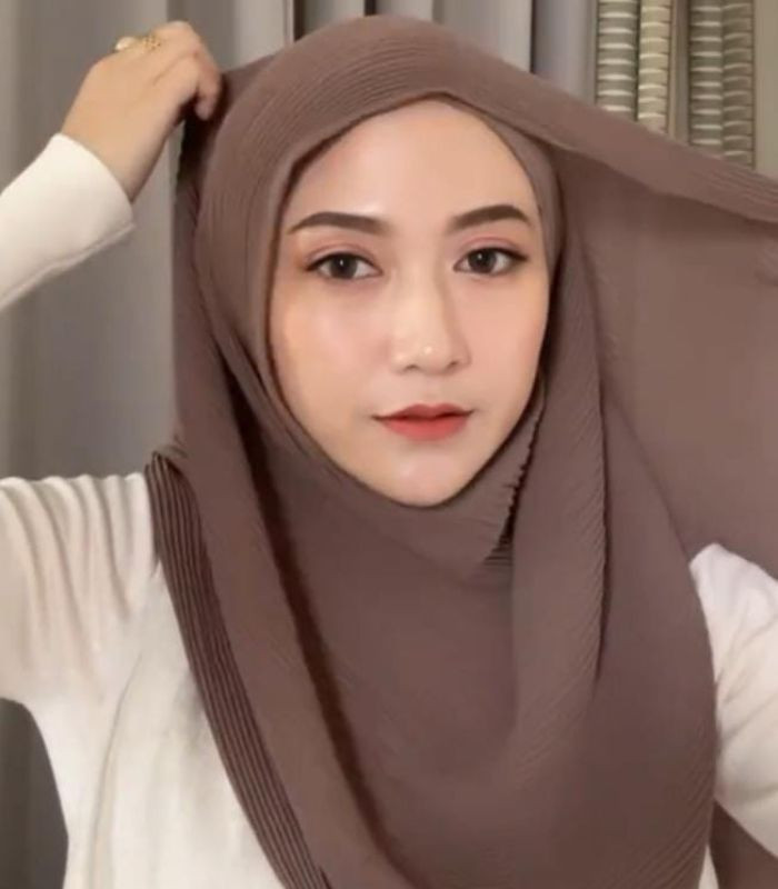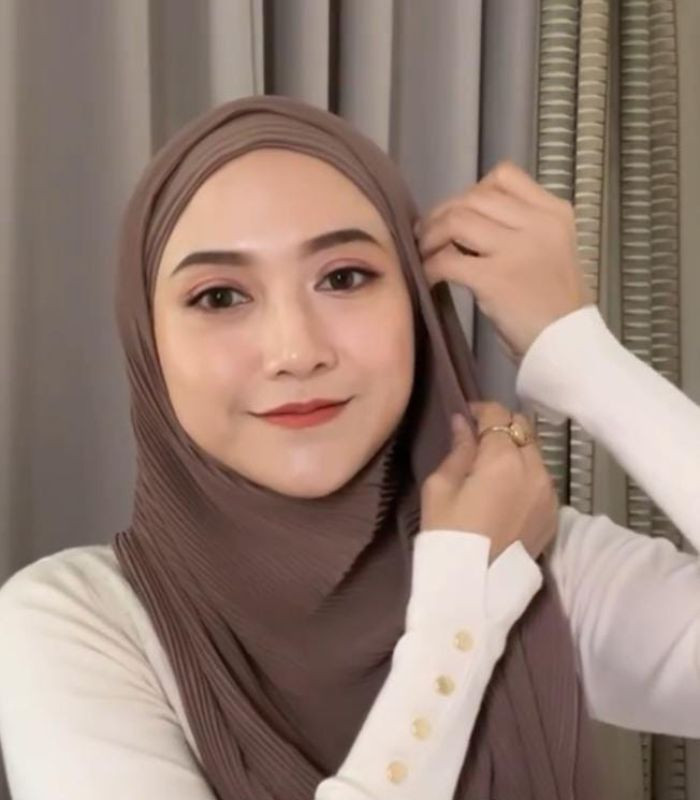 Kemudian ambil bagian sisi yang lebih panjang lalu dibawa dan dililitkan ke atas kepala disesuaikan saja dengan bentuk yang diinginkan kemudian dirapikan kembali.