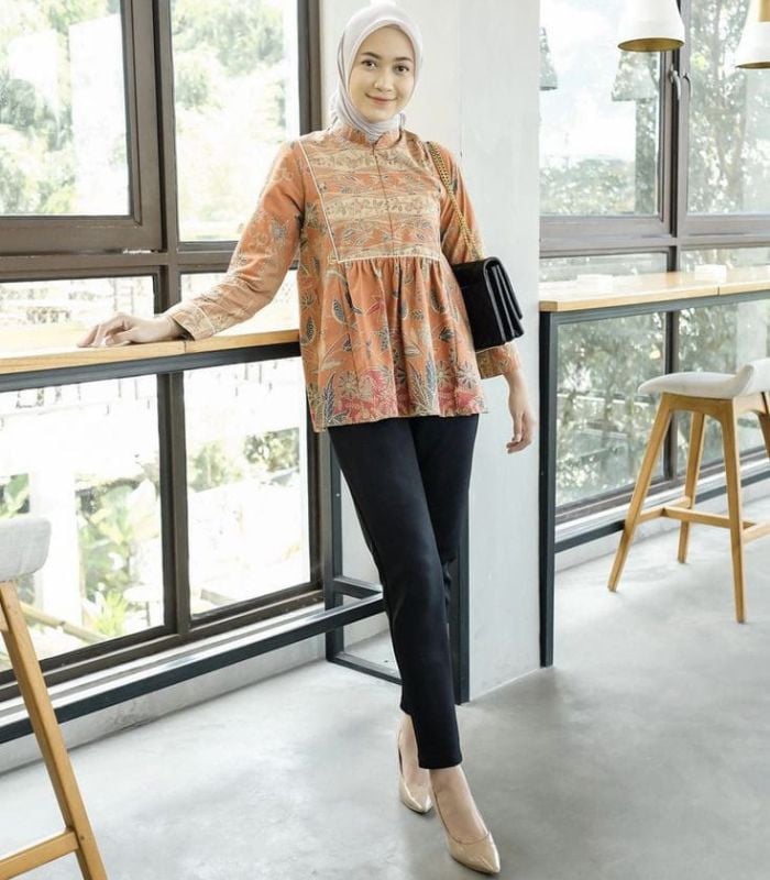 1. Pilih batik dengan model blouse tangerine yang dipadukan dengan hijab segi empat berwarna light grey dan slim fit pants berwarna hitam. Memberikan kesan cerah yang tampil casual look.