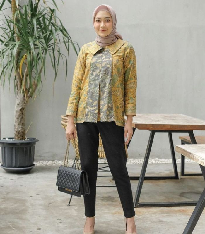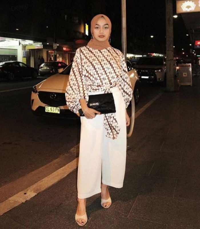 8. Pilih batwing blouse batik dipadukan dengan hijab pashmina berwarna choco dan celana kulot berwarna putih. Memberikan kesan colorful yang kalem.