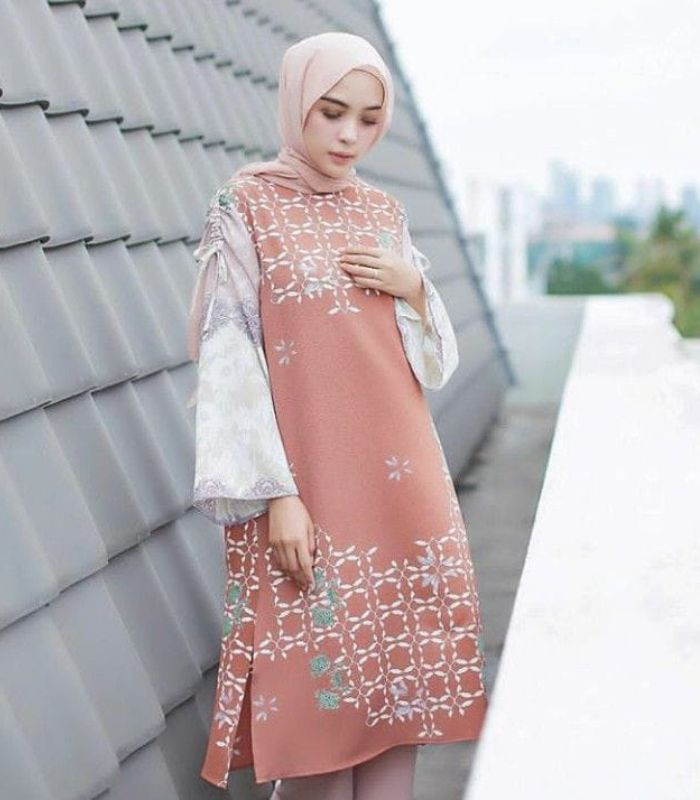6. Pilih mahagony tunik berwarna coral dengan aksen kerut dibagian atas tangan yang dipadukan dengan hijab pashmina dan straight pants berwarna blushing pink yang senada. Memberikan tampilan feminin look yang terkesan anggun.