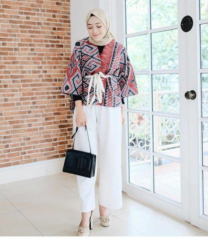 7. Padukan batwing blouse tenun etnik beraksen tali pinggang dengan hijab pashmina berwarna cream dan celana kulot berwarna putih. Jadi bikin tampilanmu lebih modis.