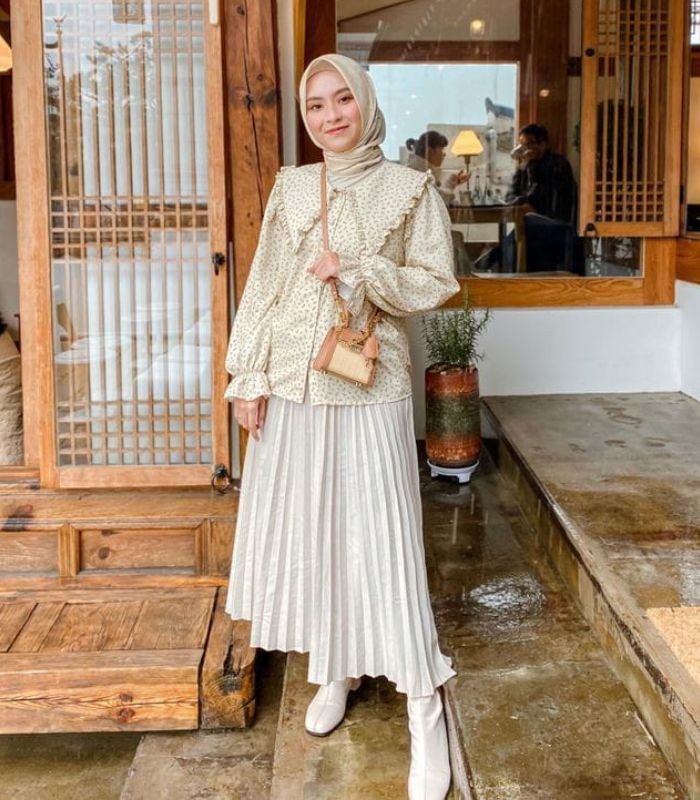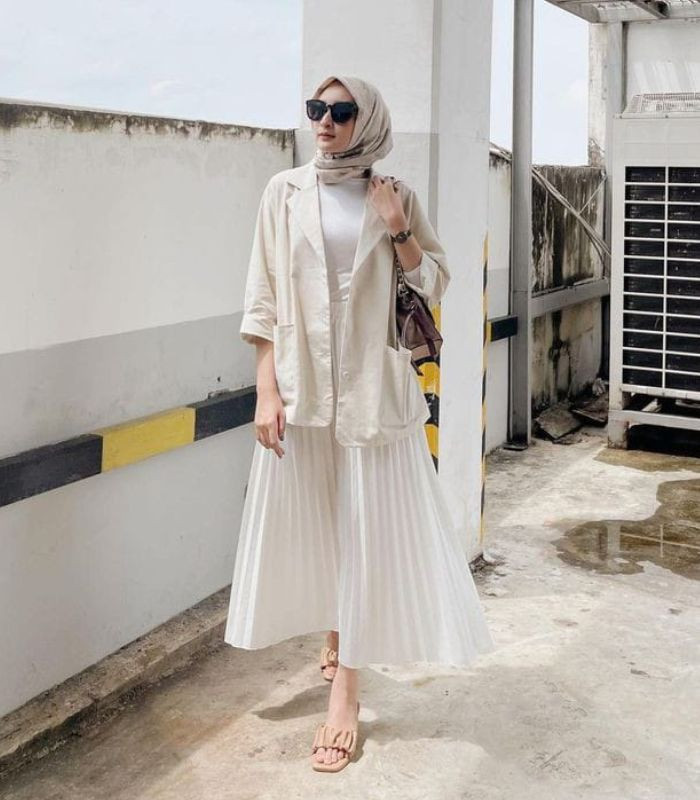 3. Padukan white long sleeve t-shirt dibalut dengan broken white blazer dikombinasikan hijab segi empat berwarna soft beige dan rok plisket berwarna putih. Bikin gayamu tampil preppy vibes dengan warna cerah.