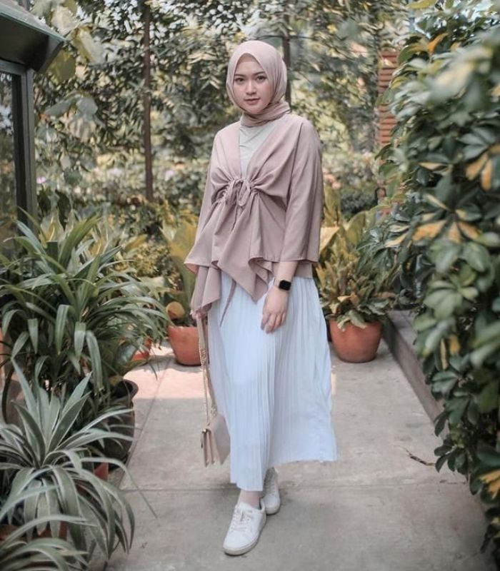 4. Kenakan long sleeve t-shirt dibalut dengan batwing crop outer dipadukan dengan hijab pashmina berwarna milo yang senada serta rok plisket berwarna putih. Memberikan kesan nude yang kalem namun tetap modis.