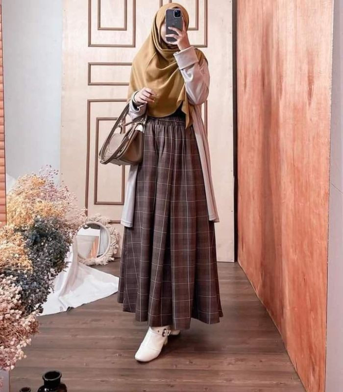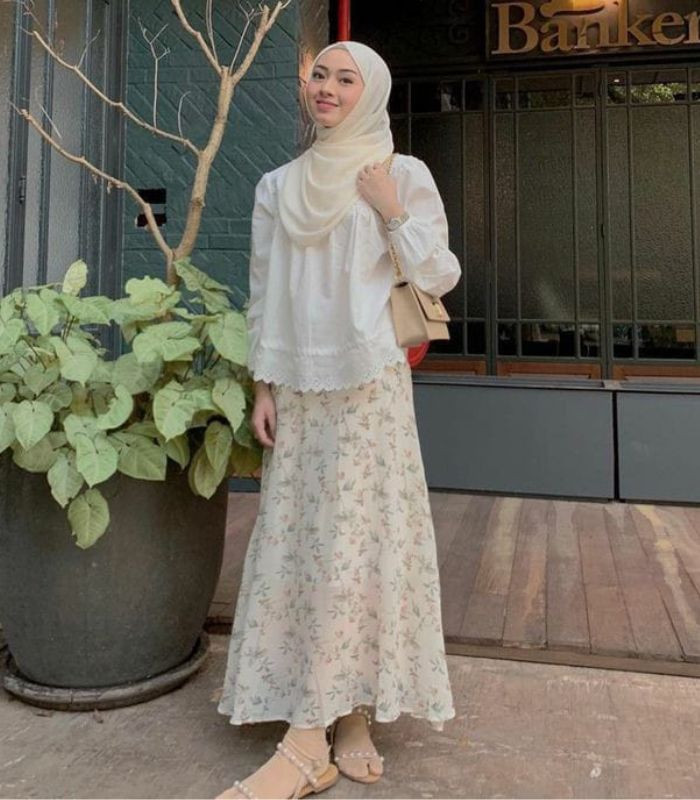 8. Style satu ini mengusung konsep warna cerah yang bikin penampilanmu jadi lebih girly. Padukan saja white crop blouse dengan hijab pashmina dan autumn skirt dengan warna yang senada. Lengkapi outfit dengan shoulder bag dan slip-on sandals.