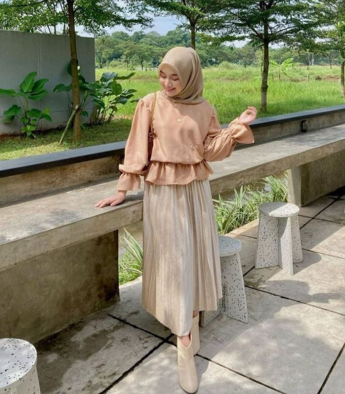 6. Kombinasikan blouse puffy sleeve dengan pleated skirt berwarna cream dan hijab segi empat berwarna latte. Berikan stand out pada outfitmu dengan menggunakan ankle boots berwarna cream jadi tampil stylish yang trendy.