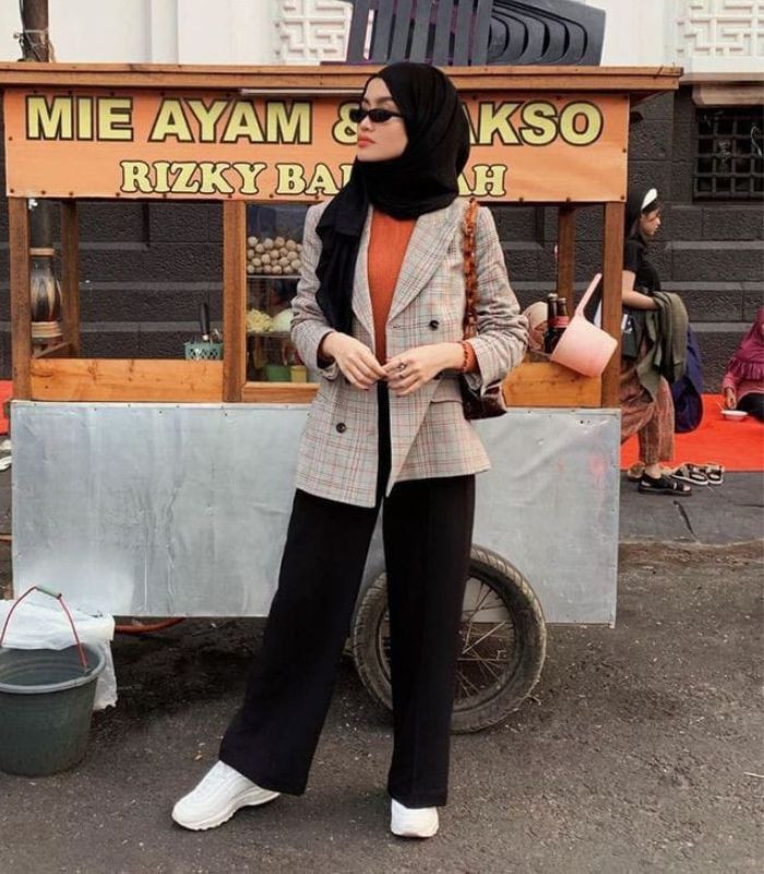 2. Gunakan long sleeve t-shirt berwarna bata dibalut dengan blazer motif kotak-kotak dipadukan dengan hijab pashmina dan highwaist loose wide leg pants berwarna hitam yang senada. Sempurnakan outfit dengan sunglasses, shoulder bag dan sneakers. Bikin tampilanmu jadi lebih gaya.