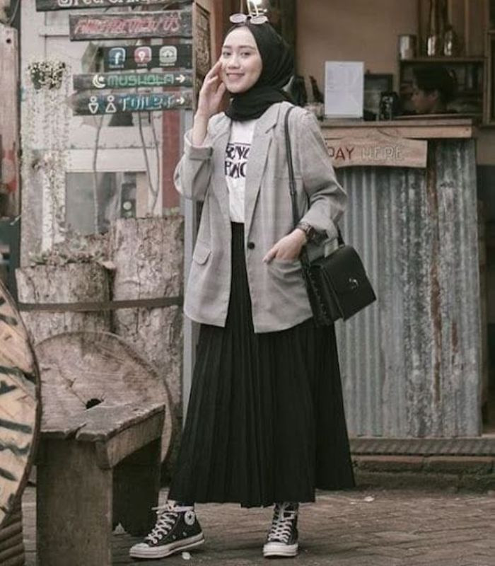 3. Mengusung konsep dark academia yang bernuansa vibe preppy dengan warna gelap. Kombinasikan long sleeve t-shirt dibalut dengan blazer motif kotak-kotak berwarna abu-abu dan hijab pashmina serta rok plisket berwarna hitam yang senada.
