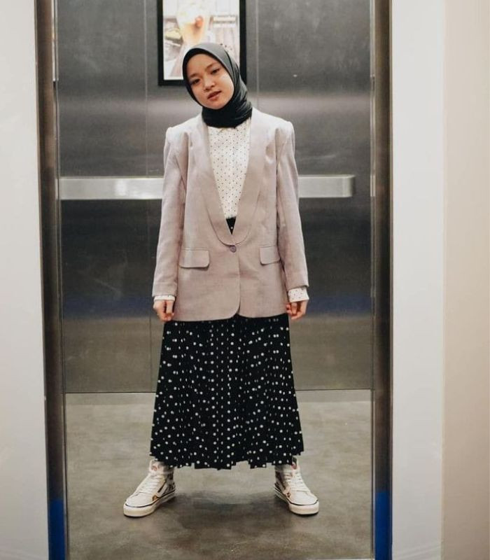 4. Kenakan kemeja putih motif polka dot dibalut dengan dusty pink blazer yang netral memberikan kesan casual yang dipadukan dengan hijab segi empat serta maxi skirt motif polka dot. Memberikan kesan gaya feminin look.