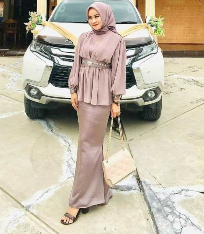 3. Model long dress satu ini bisa Anda coba ikuti agar tampil stylish dan anggun saat dikenakan. Pilih long dress dengan bahan satin dengan warna dusty pink yang dibagian depannya memiliki aksen ruffle dan balon ditangan, styling bagian bawah dengan konsep mermaid skirt.