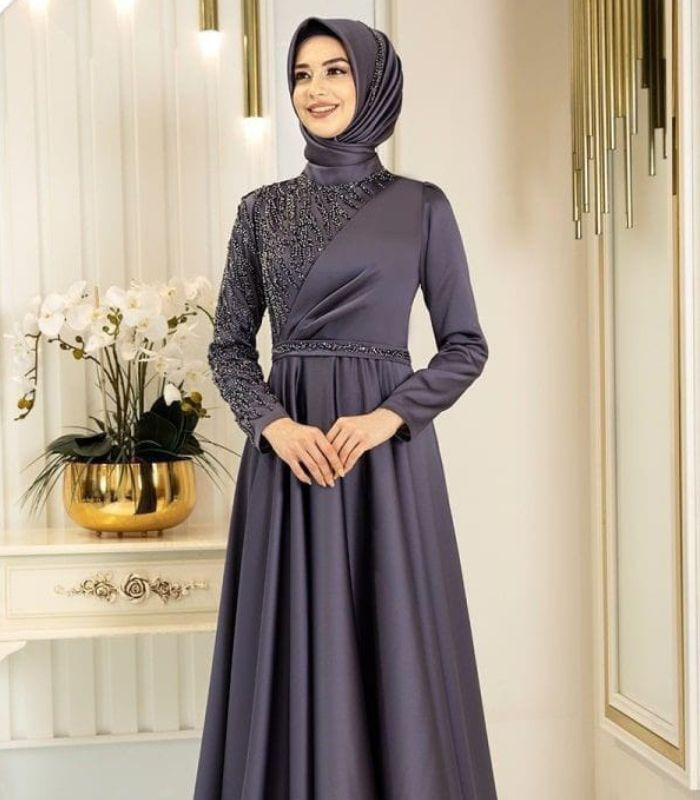 4. Style model busana satu ini cukup banyak dikenakan oleh para bridesmaid yang cocok untuk Anda yang ingin tampil modis. Kenakan long dress dengan aksen payet di bagian sisi pundak sampai tangan dan pinggang sebagai model pemisah, padukan dengan hijab segi empat berbahan silk dengan warna dark grey yang senada.