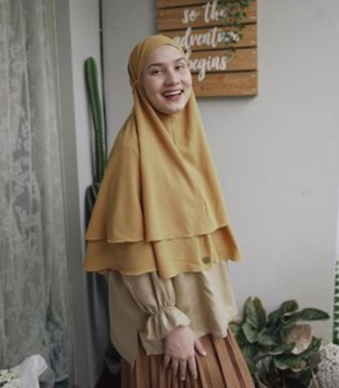 4. Simpel saja padukan hijab bergo berwarna mustard dengan long dress berwarna salem seperti ini. Jadi bikin tampilanmu warm yang cerah.