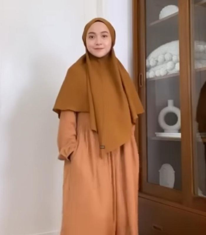 5. Pilih hijab bergo dengan warna peach seperti ini dipadukan dengan setelan busana yang homie. Tampil stylish yang anggun.