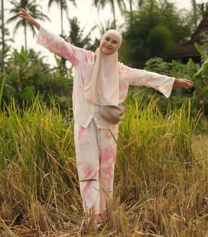 6. Padukan setelan baju tie dye berwarna pink dan putih serta hijab bergo berwarna soft pink. Memberikan tampilanmu yang simpel namun tetap terlihat girly yang aesthetic.