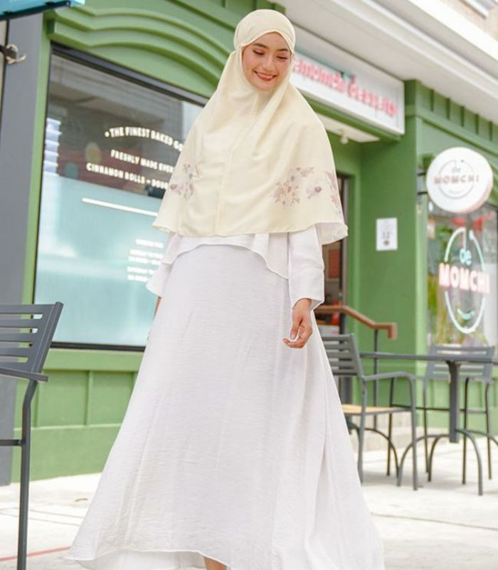7. Penampilan yang terlihat modis dengan blouse dan rok plisket berwarna putih senada yang dikombinasikan dengan hijab bergo motif bunga berwarna daffodil. Cocok buat Anda yang sekadar ingin hangout bersama teman.