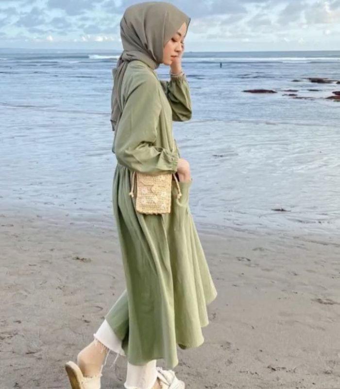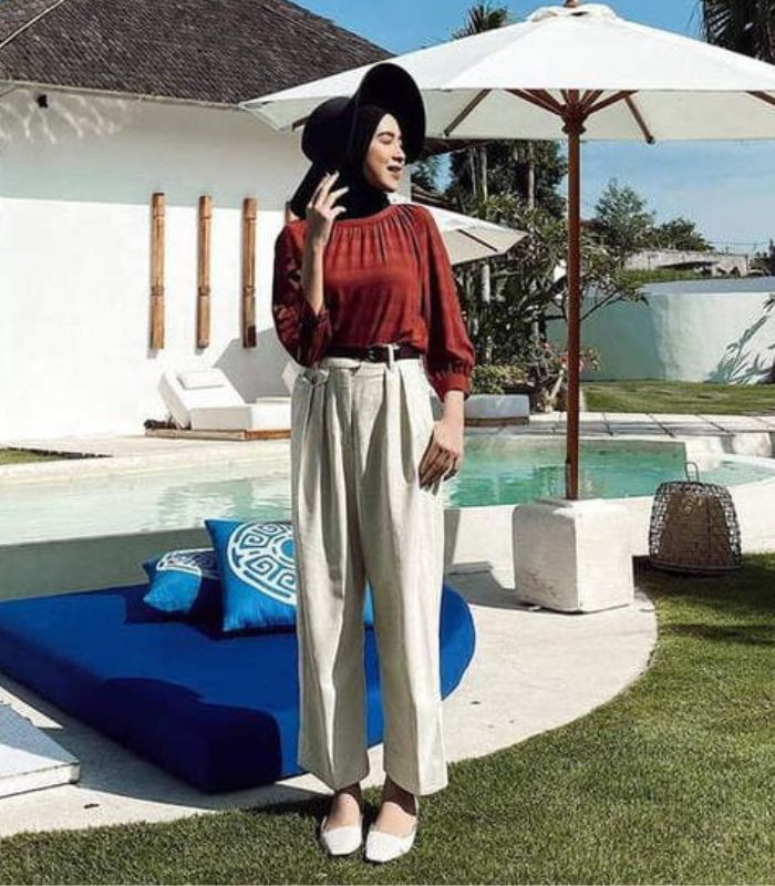 8. Terlihat simpel namun effortless! Padukan maroon blouse dengan beige linen highwaist loose pants dan hijab pashmina berwarna hitam. Lengkapi outfitmu agar terasa vibe pantai dengan floppy hat terhindar dari terik matahari.