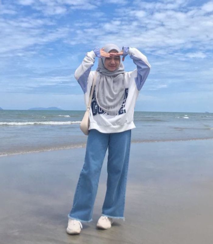 6. Anda juga bisa kenakan oversized sweater seperti ini yang dipadukan dengan hijab segi empat berwarna light grey dan highwaist loose wide leg jeans. Lengkapi outfitmu dengan sling bag dan sneakers andalan. Tampil boyfie yang kekinian!