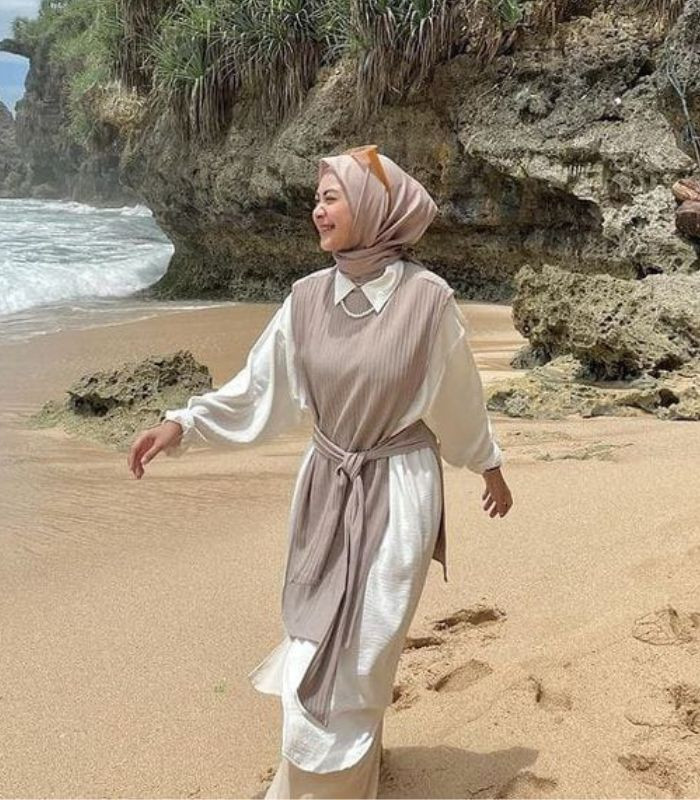 7. Tampil feminin look yang memberikan kesan cantik nan anggun. Padukan white oversized long dress shirt dibalut dengan knit vest yang berwarna dusty pink yang senada dengan hijab segi empat dan celana kulot berwarna nude.