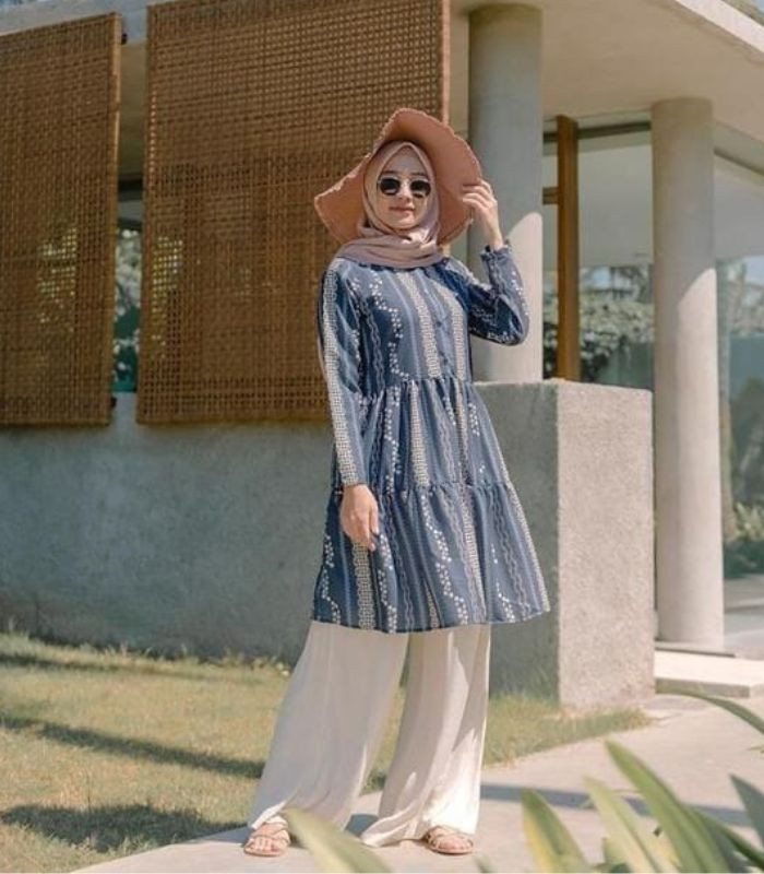 9. Pilih tunik blouse bermotif dipadukan dengan celana kulot berwarna broken white serta hijab segi empat berwarna nude. Memberikan tampilanmu jadi lebih modis yang trendy.