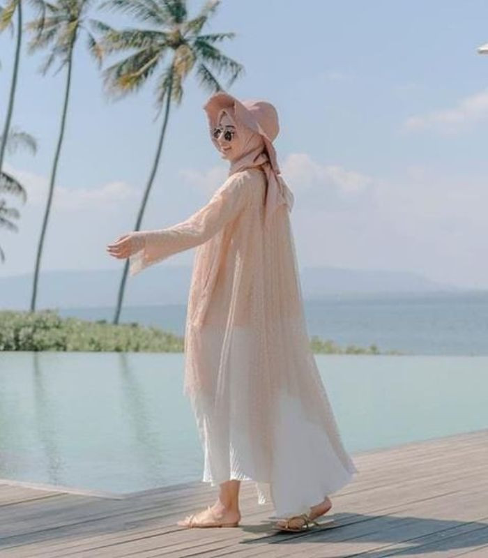 10. Style satu ini memberikan kesan girly yang manis. Mix and match nude cardigan yang senada dengan hijab segi empat dan white maxi skirt. Sempurnakan outfitmu dengan sunglasses, floppy hat dan sandals. Tampil kece maksimal.