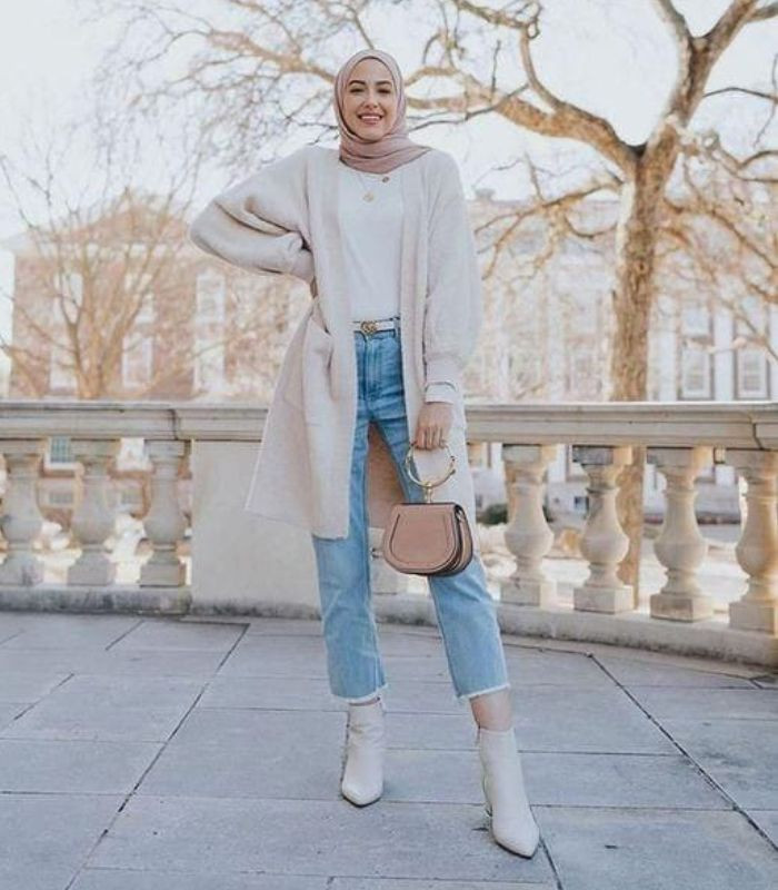2. Gaya ini memberikan kesan feminin look yang anggun. Kombinasikan white long sleeve t-shirt dibalut dengan broken white long knit outer, pilih hijab pashmina berwarna beige yang cocok dipadukan dengan slim fit jeans. Berikan statement pada outfitmu dengan menggunakan white ankle boots yang serasi.