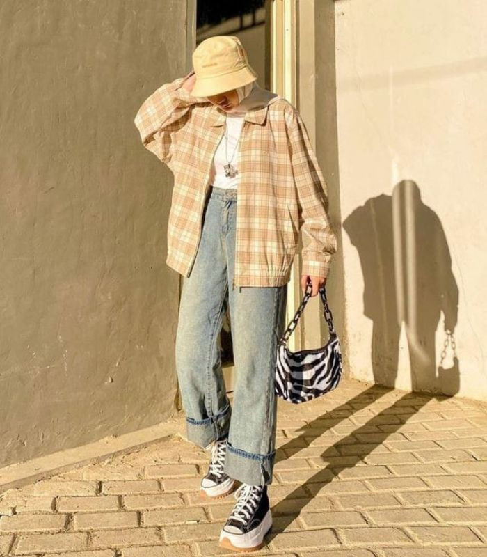 3. Padu padankan white long sleeve t-shirt dibalut dengan oversized kemeja flannel motif kotak-kotak dengan hijab segi empat berwarna soft beige dan highwaist loose wide leg jeans. Lengkapi outfimu agar semakin terlihat kece dengan bucket hat, hand bag dan sneakers andalanmu.