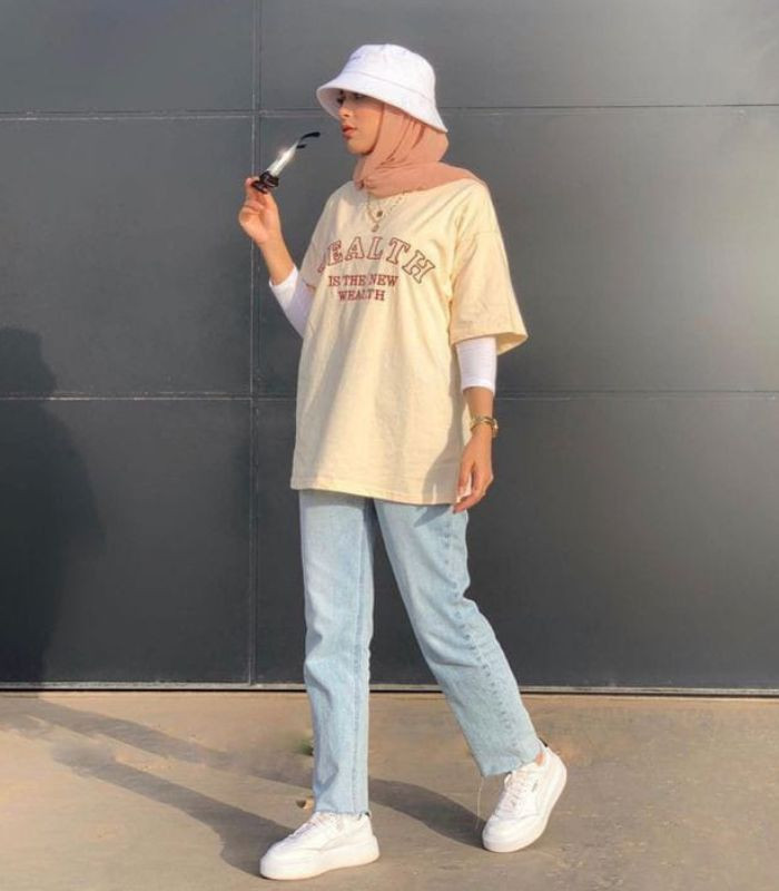 4. Tampil simpel namun terkesan effortles! Gunakan oversized t-shirt berwarna cream yang bisa di siasati dengan menggunakan manset padukan dengan hijab pashmina berwarna nude dan celana boyfriend jeans. Sempurnakan outfitmu dengan bucket hat dan sneakers dengan warna senada.