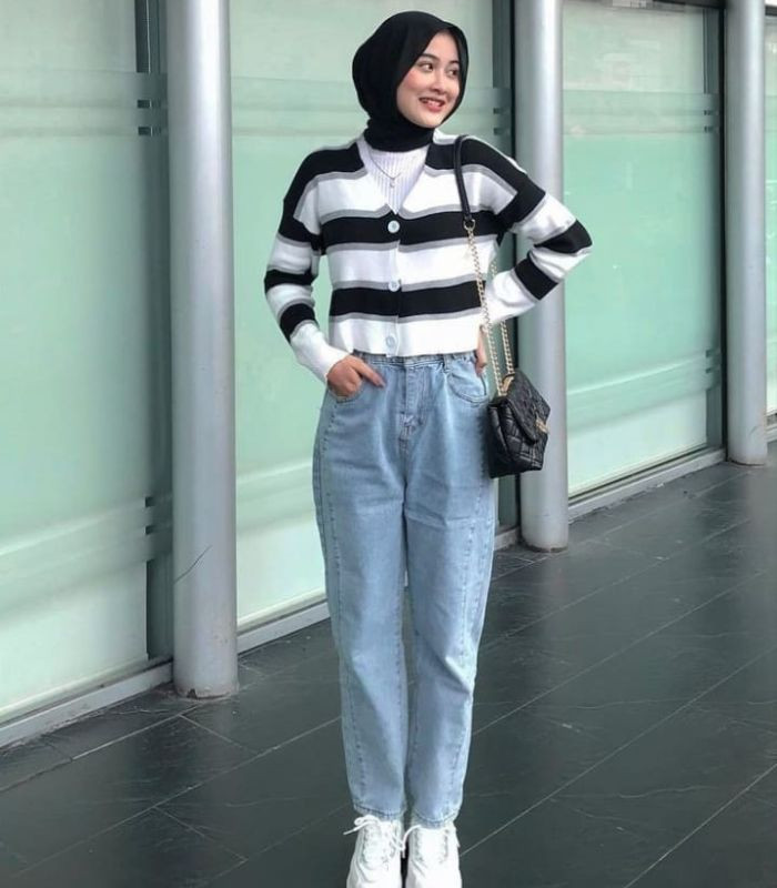 9. Style dengan mengusung warna monokrom. Simpel saja gunakan white long sleeve knit t-shirt dibalut crop top cardigan dan hijab pashmina berwarna hitam dipadukan dengan celana boyfriend jeans. Lengkapi outfitmu dengan shoulder bag dan sneakers.