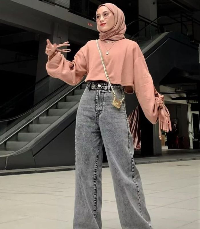 10. Terakhir, cocok buat Anda yang ingin tampil dengan vibe softgirl gunakan crop top blouse dengan aksen kerut dibagian tangan dan hijab pashmina dengan warna dusty pink yang senada dan highwaist loose wide leg jeans seperti ini.
